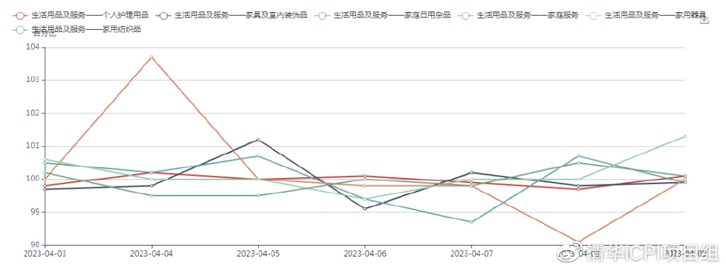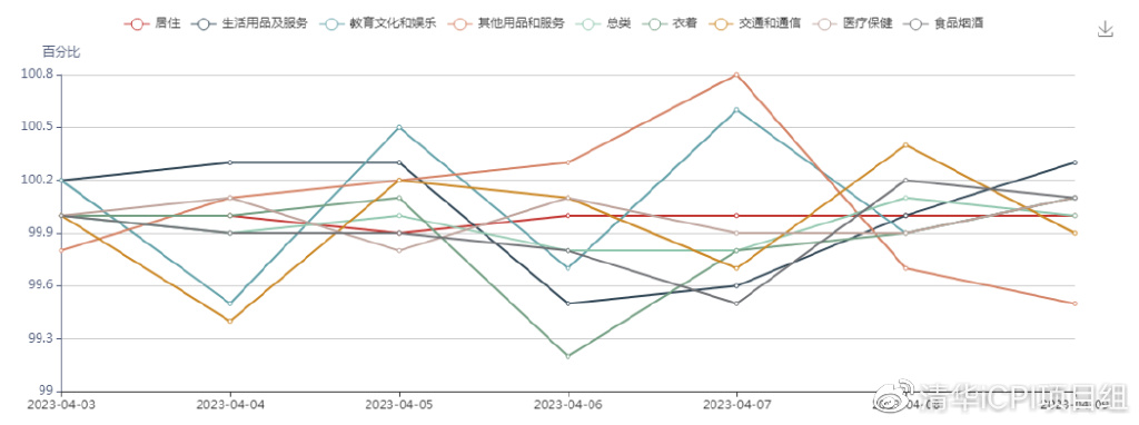 统计结果显示,2023年4月3日——2023年4月9日,iCPI周指数总水平环比下降0.1%,其中iCPI八大类本周环比变化情况如下: