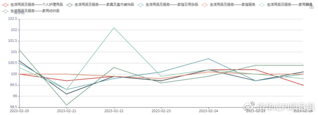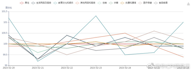 本周各大类日指数波动幅度较大。教育文化和娱乐大类在2月23日涨幅达1.3%,下设中类教育在2月23日涨幅最大达到2.1%。