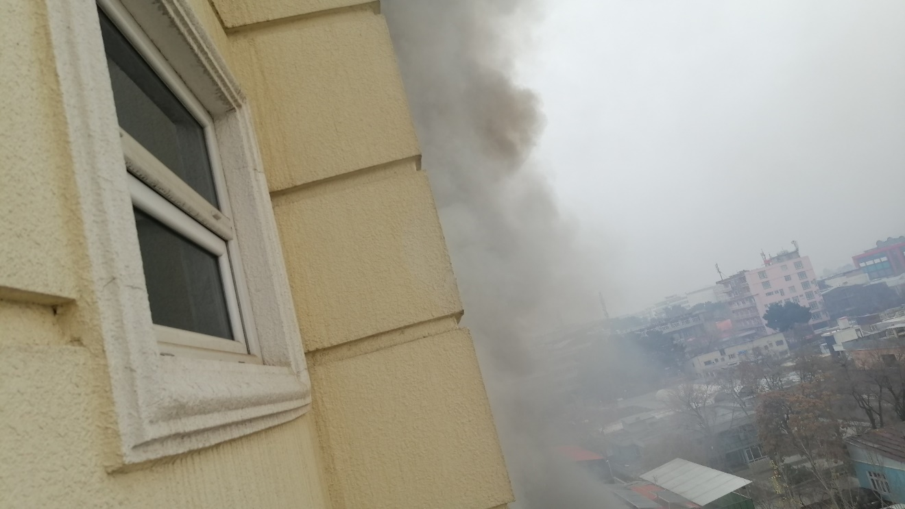 期间我不断地和外面的同胞联系,询问大家的情况,也回答他们的问题。中间有一段时间稍微安静点,我悄悄地从卧室进入套间的客厅,发现已经没电了。我本来还想通过猫眼看一眼楼道的情况,结果什么都看不见——这个季节喀布尔的天到下午三四点基本上就比较黑了,再加上采光设计的原因,可能更重要是有烟雾。