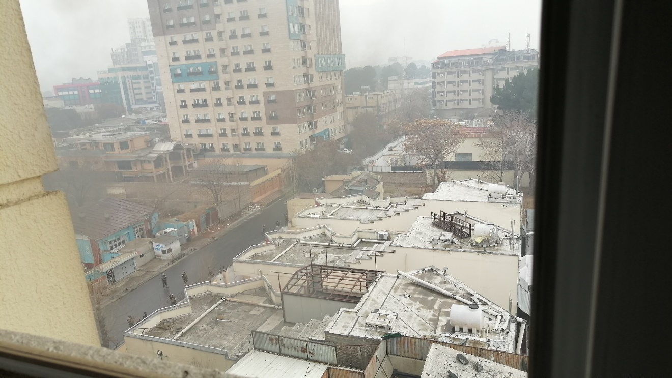 我房间两面有窗,分别可以看到楼外西面和南面的情况,当时我一直想看街上有没有塔利班军警过来支援,但在前二十分钟里没有发现街上有明显的警力增加。后来知道,这两面因为不直接临街,不是交火的主战场。虽然客房基本都分布在整个楼的南半侧,因此发生大火和频繁爆炸,但还不是与楼外发生枪战最集中的方向。