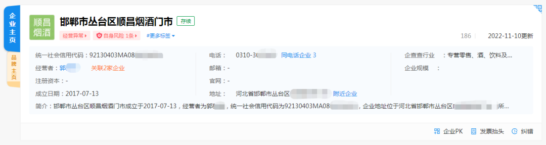 据公开信息显示,邯郸市丛台区顺昌烟酒门市负责人:郭某某,地址:河北省邯郸市丛台区,经营范围:烟零售、预包装食品、办公用品批发零售。