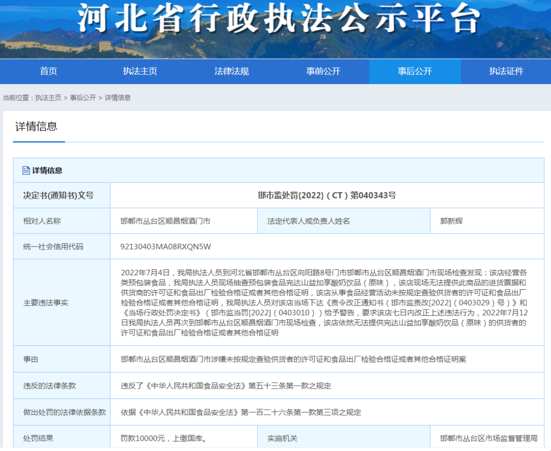近日,河北省行政执法公示平台发布了邯郸市丛台区顺昌烟酒门市违反《中华人民共和国食品安全法》的处罚通知。
