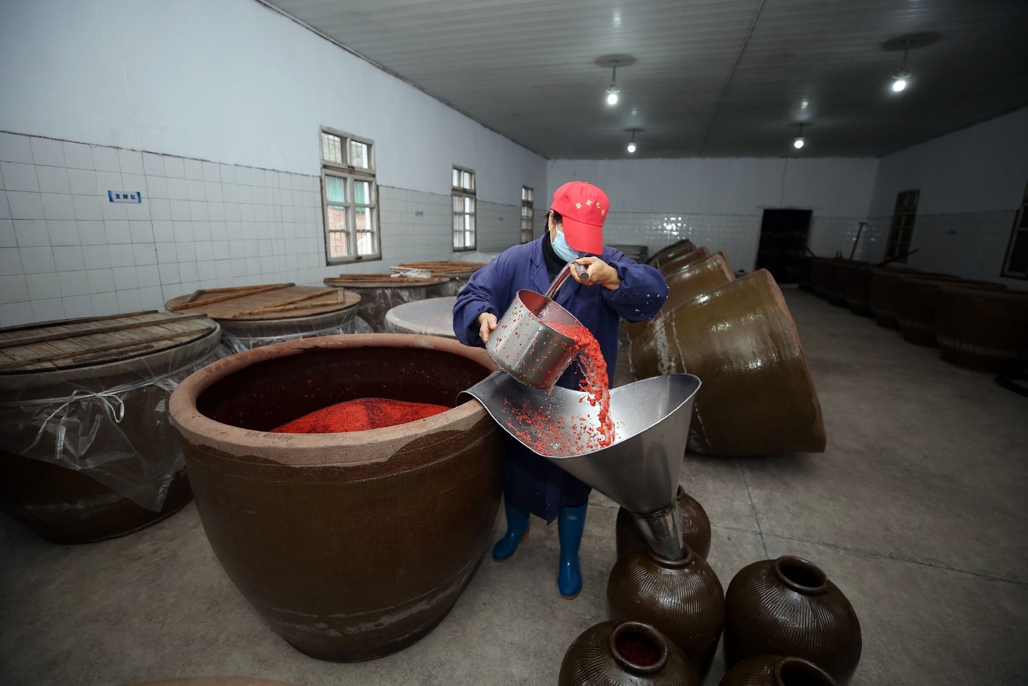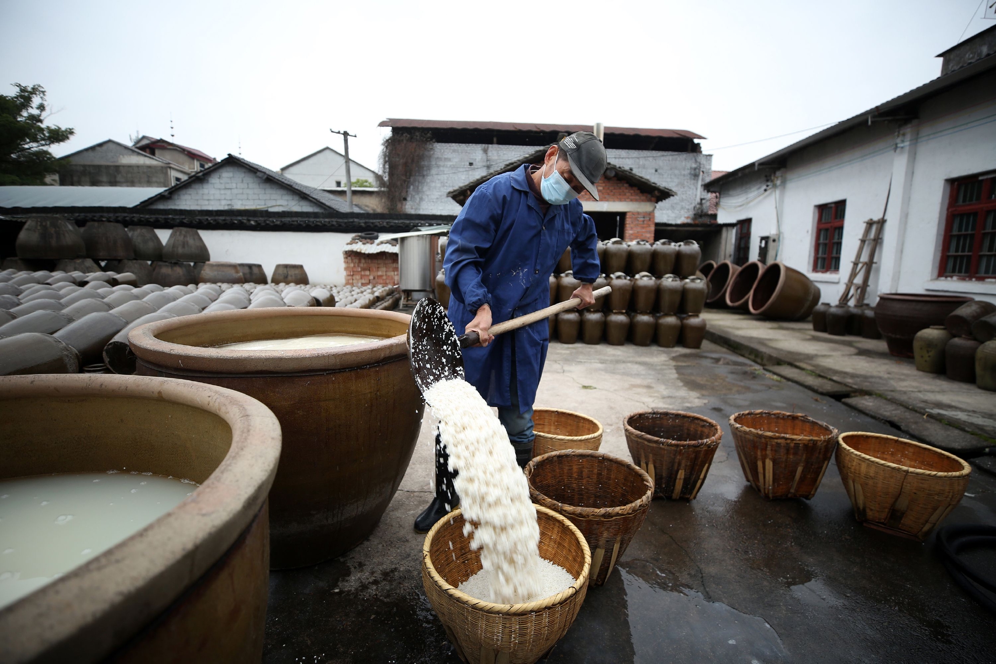 12月16日,在浙江省东阳市马宅镇屠梁村一酒厂,酿酒师傅将大酵缸中发酵后的红曲酒舀出,装到小坛子里,准备运到室外低温发酵。新华社发(胡扬辉 摄)