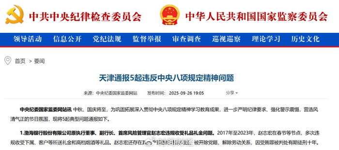 9月26日,天津通报5起违反中央八项规定精神问题。其中,首个典型问题即为“渤海银行股份有限公司原执行董事、副行长、首席风险管理官赵志宏违规收受礼品礼金问题”。