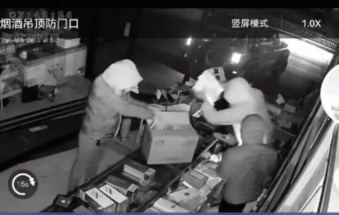 视频显示,几名男子开一辆越野车撞开店铺的玻璃门,发出巨大的声响。随后车就停在店门口,二三名男子戴着帽子和口罩,拿着手电筒进入店内,不慌不忙地开始往车上分批搬运烟酒,有的烟酒还是装进了纸箱,然后整箱地搬上了车。