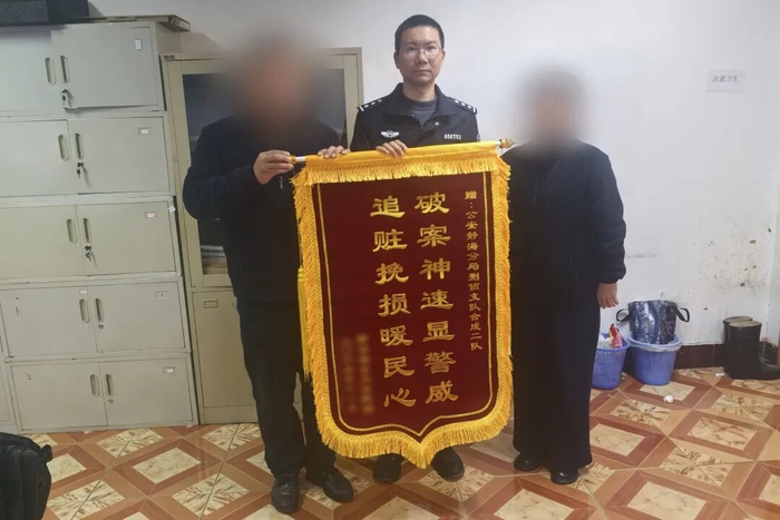 案件告破后,店主专程送来锦旗“破案神速显警威,追赃挽损暖民心”。