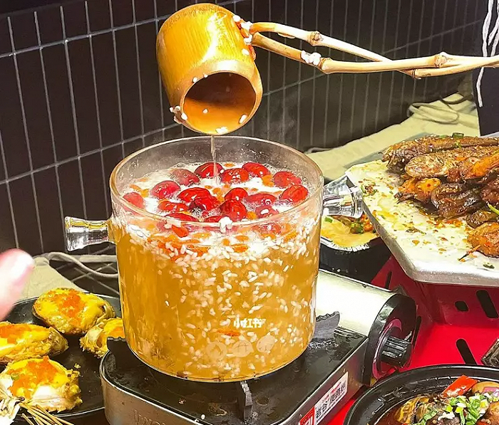 一辆车,摆开两三张小桌和椅凳,在小麦啤酒中加入甜酒糟、红枣和枸杞,小麦清香和滋补食材的甜意相融合,煮好的酒饮还作为泡面、关东煮、烤串的搭配。在桔黄色的灯光下,煮酒时的热气在寒冷的黑夜里显得温暖又具有烟火气息。