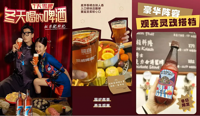 知名啤酒厂牌泰山原浆还推出冬季限定的“7天雪啤”,采用红枣加枸杞的煮啤酒经典搭配,主打冬天喝的啤酒。