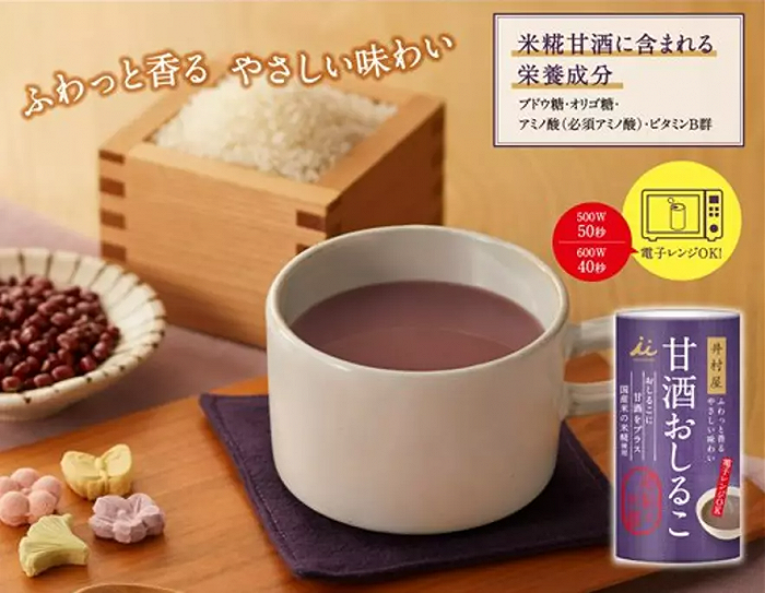 去年八月,井村屋株式会社推出的红豆甘酒,由米曲甜酒和带有浓郁甜味的红豆混合而成,能直接在微波炉中加热,还原温暖的热饮体验。