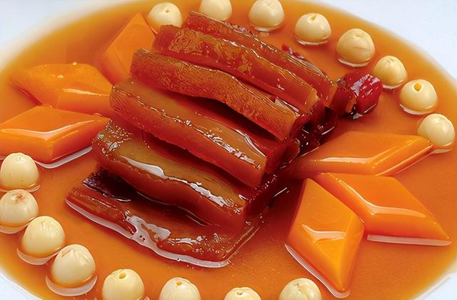 当天还上了一道来自南方的知名好菜,这道菜选用的是金华火腿,配菜里面除了有蜂蜜之外,还有莲子,再加猪油去制作,最后用淀粉水去勾芡成汁,口感甜而不腻,吃起来味道浑厚。