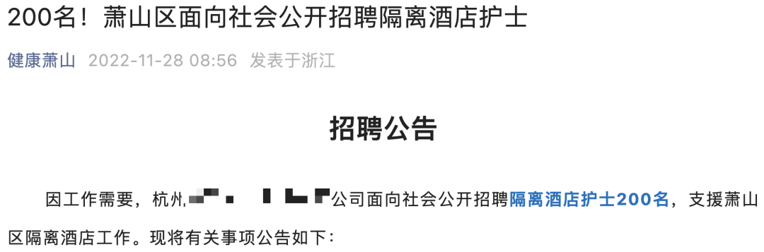 近日,杭州市萧山区卫健委发布了隔离酒店护士的招聘信息: