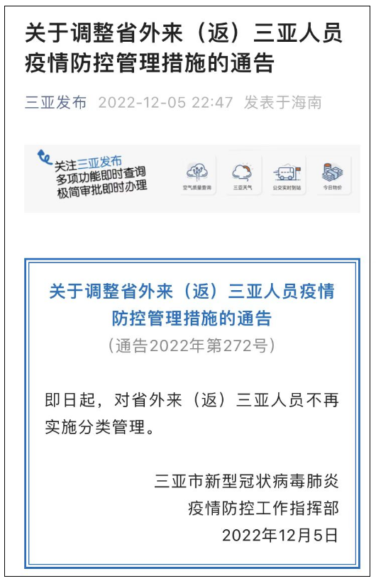 12月5日晚,三亚市新冠病毒肺炎疫情防控工作指挥部发布通告,调整省外来返三亚人员疫情防控管理措施,表示从即日起,对省外来(返)三亚人员不再实施分类管理。