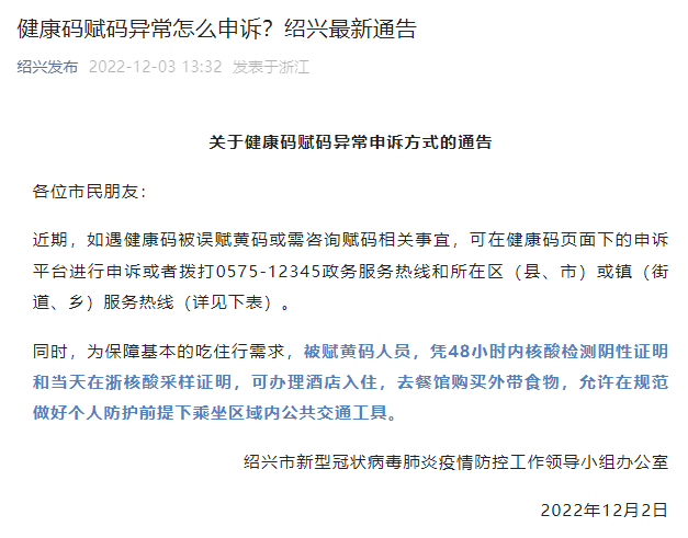 微信公众号“绍兴发布”12月3日发布《关于健康码赋码异常申诉方式的通告》: